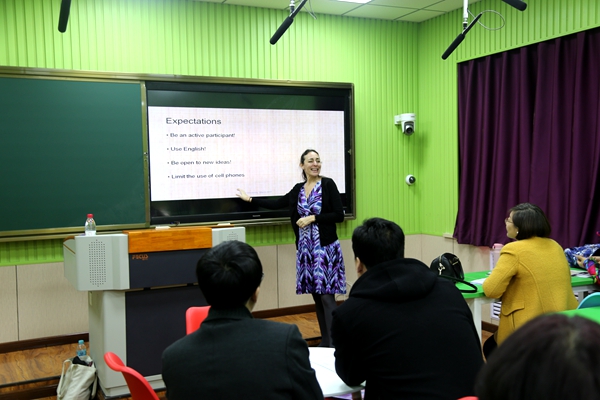 海蒂.乔.巴特利特,来自于美国威斯康星州,曾在在美国、日本和哥伦比亚从教。目前,巴特利特女士在山东省曲阜师范大学教授英语阅读教学和文化课程。本次教学工作坊,她展示了“阅读和写作的教学方法”,教授方法较传统教学更侧重于发展学生主观理解能力,并通过鼓励学生的方法提升教学效果。
