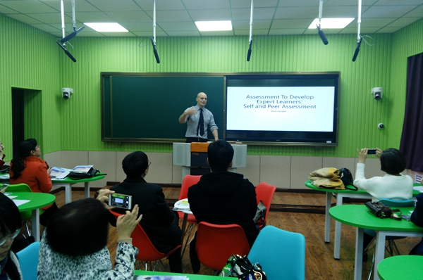 凯文.斯普雷特毕业于美国宾夕法尼亚州立大学,现为沈阳东北大学英语研究员。他曾在亚洲多个国家给教师做英语培训工作坊,他主要教授学术写作、学术口语互动及辩论、阅读策略与文学。在本次工作坊的教学中,他介绍了“自我和同伴评估”方法,通过讲解课堂教学组织方法及学生自我和同伴评价的技巧,让教学组织更有效,也向大家展示了这种替代评估方法对鼓励学生参与课堂学习及学生的发展更为有益。