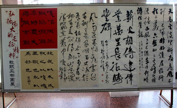 本次书画展自10月初以来,我校教职工认真准备,积极参与,经过了创作、征集、评选、布展等阶段,历时近一个月时间,共征集作品70余件,评选出优秀作品23件(其中硬笔书法作品6件、软笔书法作品13件、绘画作品4件),展出16件。展出的书画作品,历史和现实交融、信仰与精神辉映,展示了我校教职工积极向上的精神风貌。