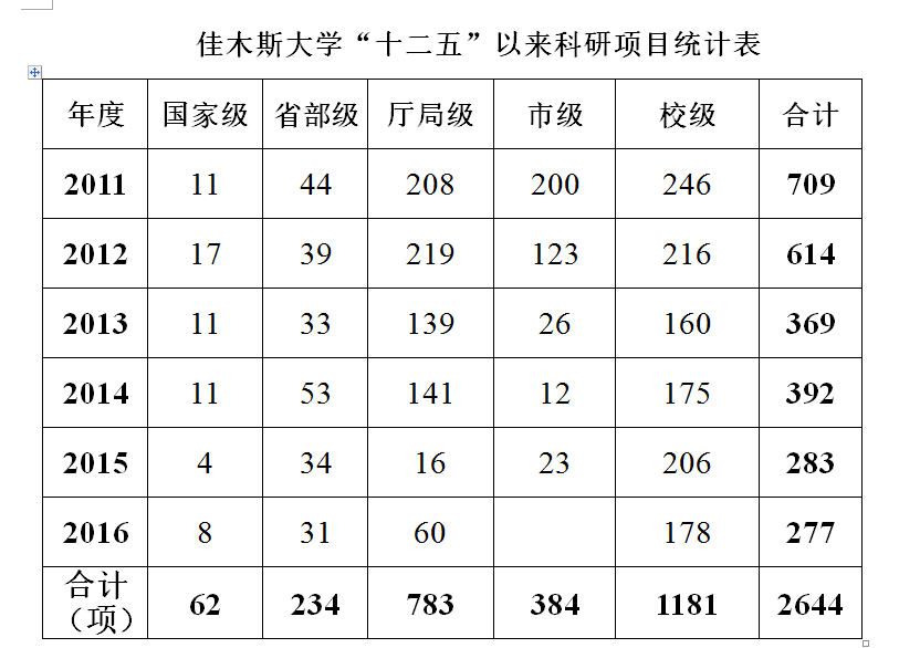 “十二五”以来,我校科技工作紧紧围绕服务国家、省和地方科技工作大局、提高学校自主创新能力和学术地位来展开。坚持以创新求发展、以特色展优势的方针,以增强自主创新能力为目标,继续深入实施科研工作三战略,即以夺得国家基金项目,解决行业企业关键技术问题为核心的“项目拉动科学研究战略”,以服务龙江经济社会发展为宗旨的“科技成果转化战略”,以研究三江地区特色文化为核心的“社会科学研究提升战略”;强化了“体制、项目、人才、平台”四位一体工作的建设,通过深化科研管理体制机制改革,完善科研管理制度,加大了青年科技创新人才和科研骨干人才的培养力度,积极打造协同创新团队、高水平科技创新和技术服务团队;强化以教育部工程中心和大学科技园(孵化器)为代表的研发平台的建设;突出了应用技术和适用技术的培养和孵化,强化了科技服务地方、与经济社会结合的作用,一批应用型成果实现了落地转化,“十二五”期间各项科技指标均达到了我校有史以来的最高值,基本形成了具有传统专业特色、众多学科优势、发展较为均衡的自主创新体系和科学研究体系,为建设特色鲜明的高水平大学提供了强有力的支撑,对地方经济社会发展起到了重要的推动作用。